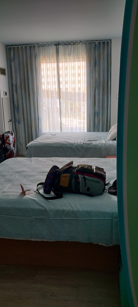 Pieni merenneito -huoneet olivat jenkkimittapuulla melko pieniä, mutta majoittivat kuitenkin mukavasti kolme aikuista per huone. Huoneissa oli kaksi isoa parisänkyä, jotka olivat todella korkeita ja yllättävän mukavia – niiden alle sai kätevästi survottua omat matkalaukut pois jaloista. Amerikkalaisille voisi joku toki kertoa pussilakanoiden olemassaolosta, sen verran omituiset peittokulttuurit heillä on edelleen. Kaappitilaa oli kuitenkin varsin vähän: yksi lipasto (josta jokainen meistä omi yhden laatikon), pieni naulakko ja isompi naulakko henkareilla ja hattutelineellä oli kieltämättä turhan vähän kaikille vaatteille.