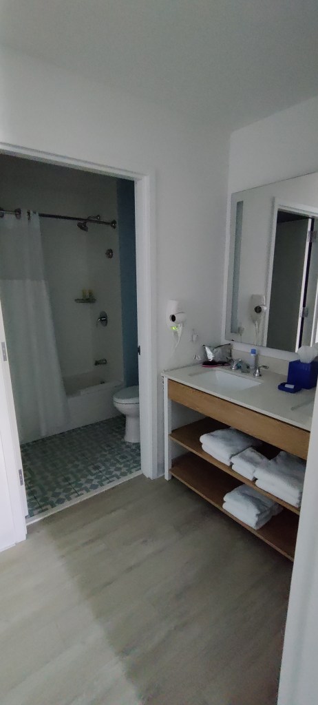 Dockside Inn and Suites oli siinä mielessä perinteinen hotelli, että aulassa olevasta respasta lähdettiin joko vasemmalle tai oikealle ja huoneet sijaitsivat näissä kahdessa tornisiivessä. Meillä oli kahden makuuhuoneen sviitti viidelle hengelle eli käytännössä erillinen makuuhuone, jossa oli parisänky, kylpyhuone (erillisellä lavuaaritilalla) ja yhdistetty keittiö-makuuhuone, jossa oli kaksi parisänkyä. Sviitti oli luonnollisesti paljon tilavampi, mutta eipä täälläkään pahemmin kaappitilaa löytynyt. Hotellihuone oli kuitenkin ahkerammin käytössä, koska harmillisesti puolet porukastamme oli kipeinä Disney-osion jälkeen. Jenkki-tv:stä tuli onneksi iltaisin Marvel-elokuvia, joten mikäs niitä oli katsellessa.