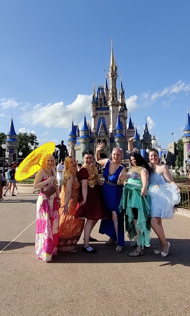 Noudatimme siskojen kanssa asuinemme Disney-bound-henkeä: Tarjalla oli Frozenin Elsa-henkinen asu ja Sari oli tehnyt itse huikean Pieni merenneito -mekon. (Oma Kultu-mekkoni koostui valmiista paljetti-t-paidasta, johon olin tehnyt hihat ja hameen kirppisverhoista!) Seurueemme muut leidit olivat upeita muuten vain ilman viittauksia tiettyihin hahmoihin.