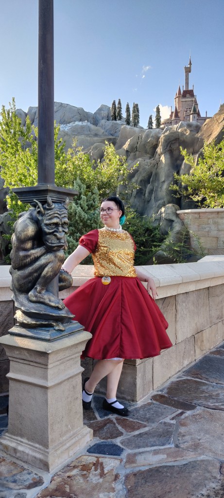 Pidimme iltapäivällä pienen tauon puistoilusta ja palasimme takaisin viimeisen päälle tällingissä. Illan ohjelmassa oli päivällinen Be Our Guest -ravintolassa, joka sijaitsee Kaunottaren ja hirviön Hirviön linnassa, joten pukuteemakin oli prinsessa. Vaikka aikuiset eivät saakaan vetää täysiä cosseja päälle, ”Disney-bound” eli tietyn hahmon teemaan väreittäin ja tyyleittäin sopiva asukokonaisuus on varsin sallittua. Siksi esimerkiksi oma Kultu Kimallus -asuni oli tyllihameineen hieman fiftarihenkeen suunniteltuna polvimittainen (täyspitkät helmat ja viitat eivät nekään ole sallittuja, etteivät ne tartu laitteissa mihinkään).